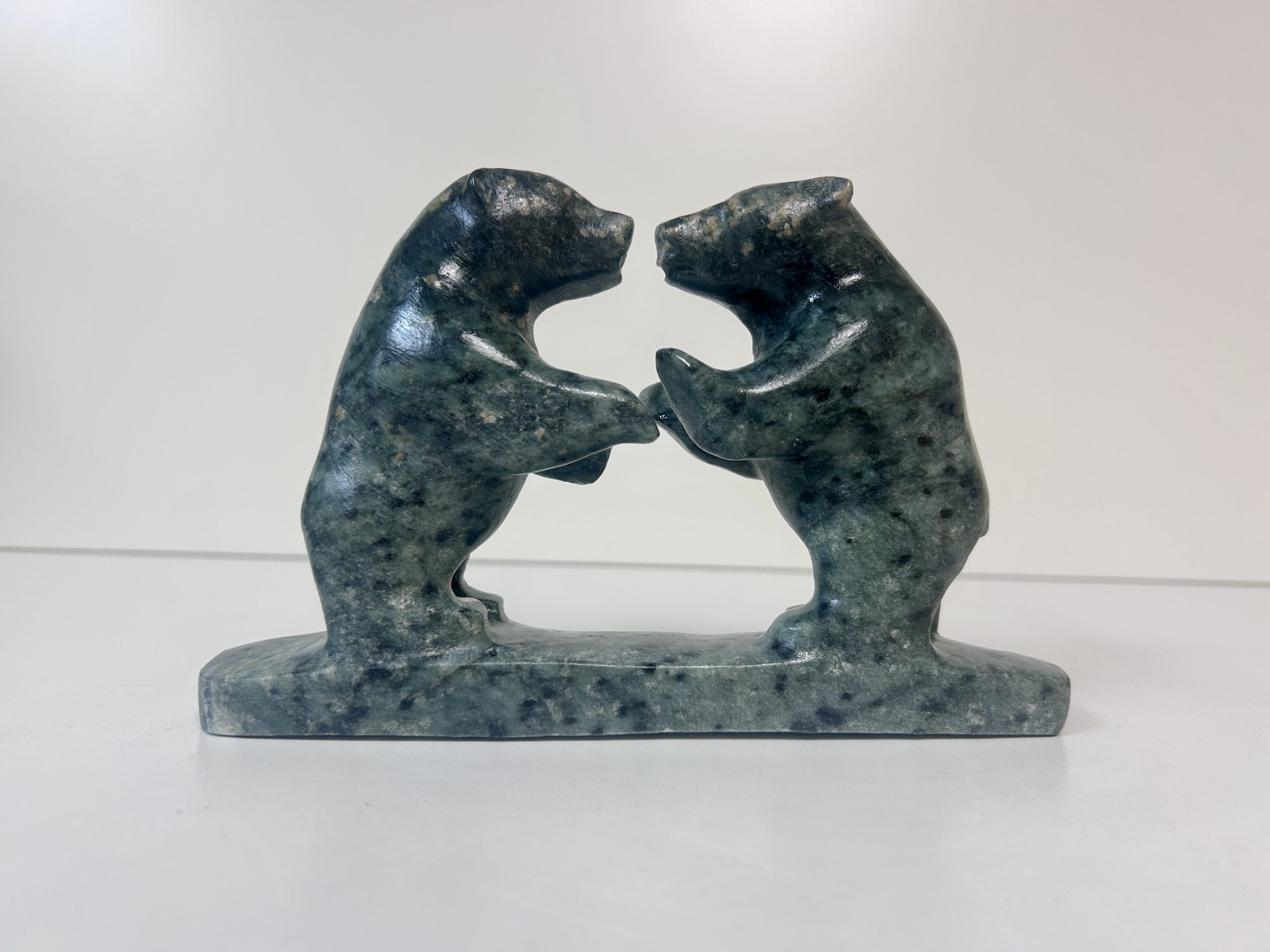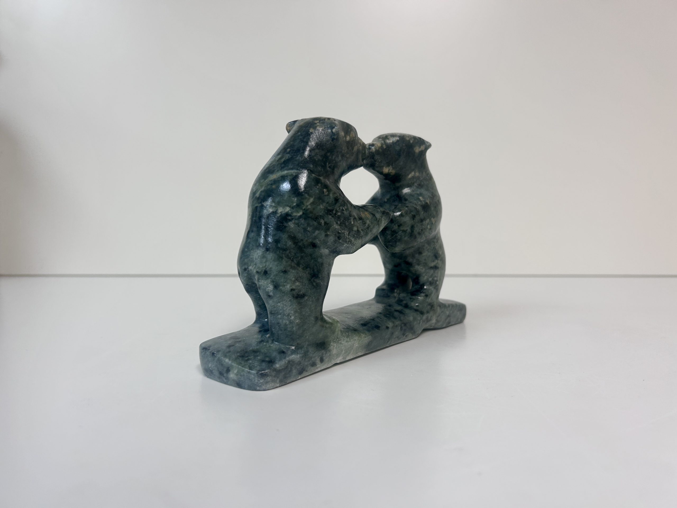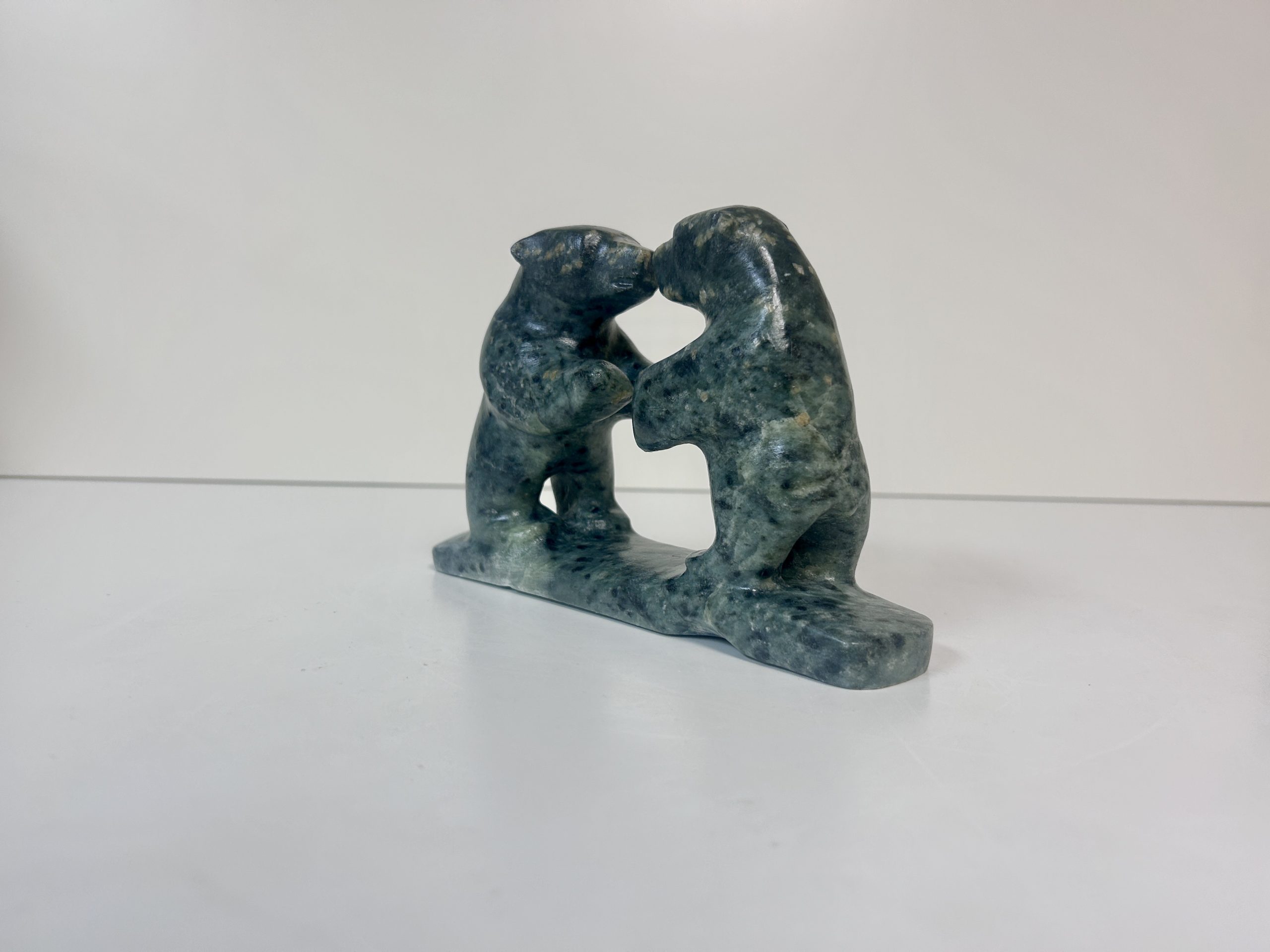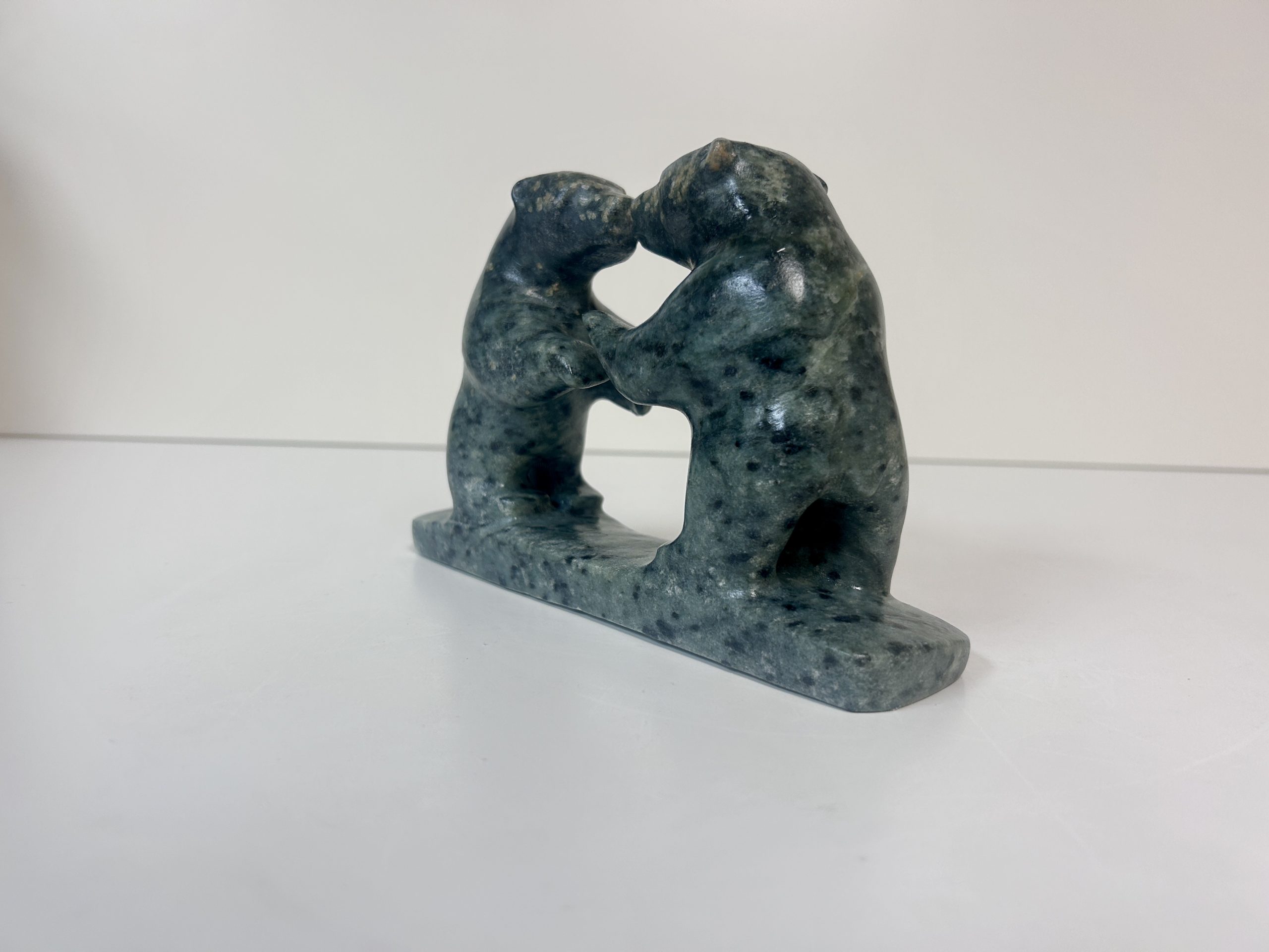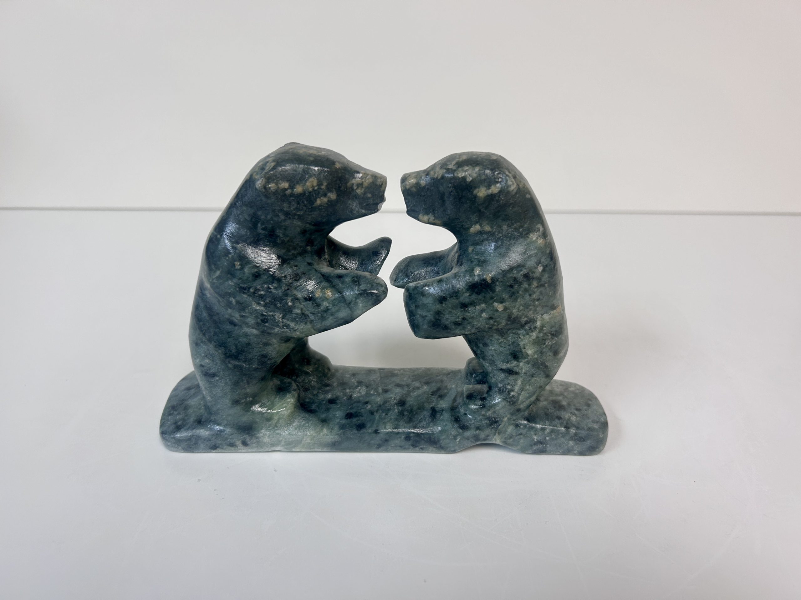Borealis Bear by Anthony Antoine Appeared on Page 17 of Alberta Native News – June 2018 Beautiful and unique colouring Handmade from soapstone Measures 15″ in length Measures 5.5″ in height Weighs 13 lbs