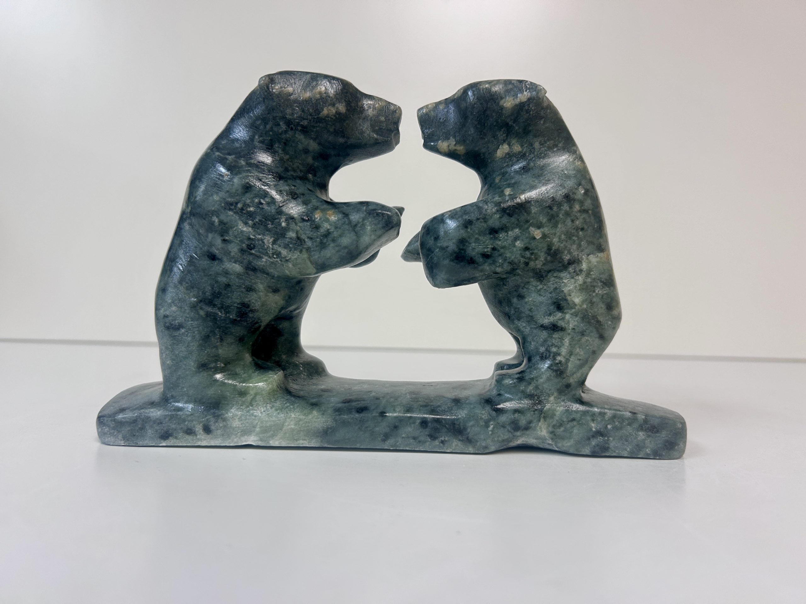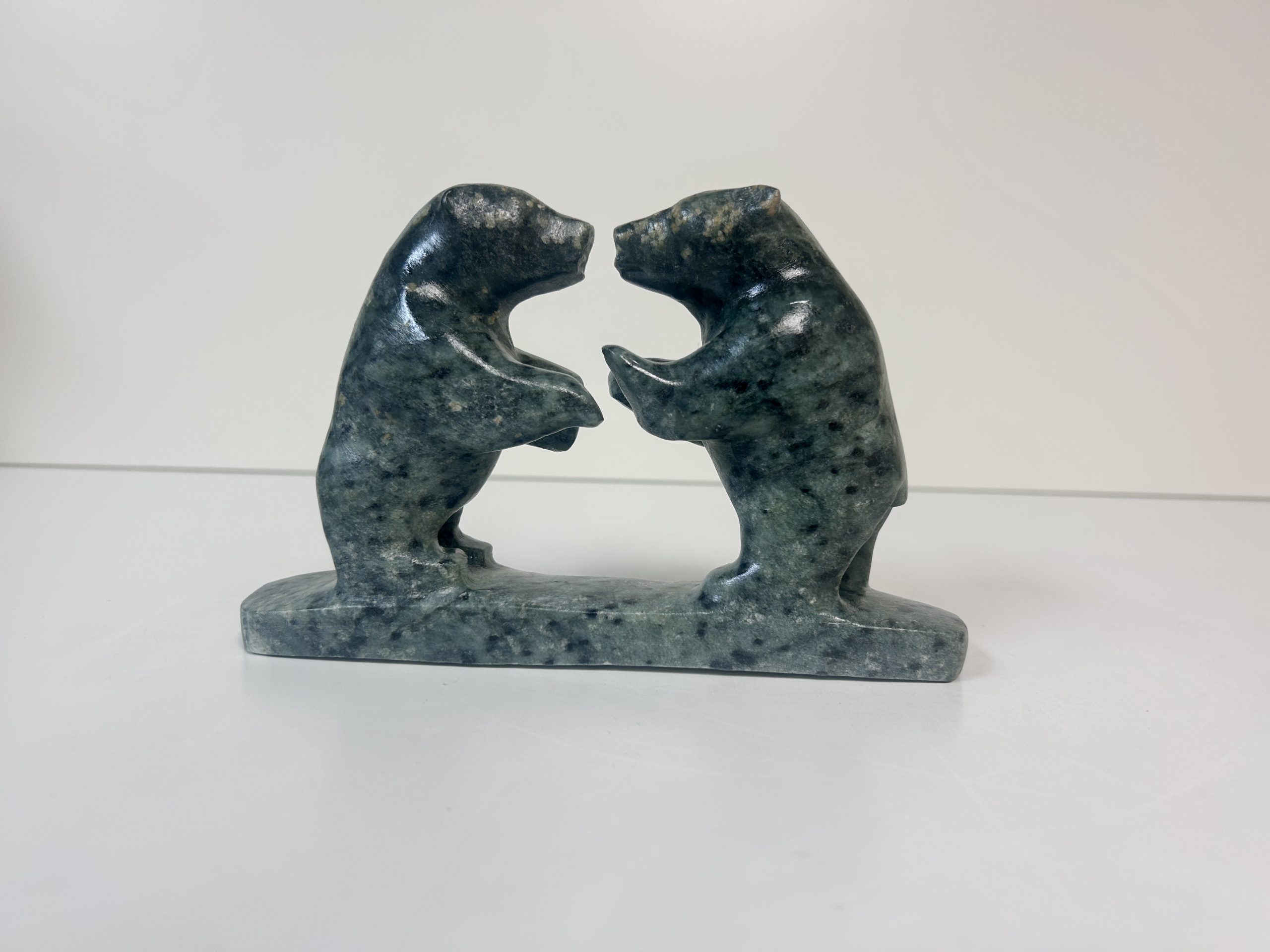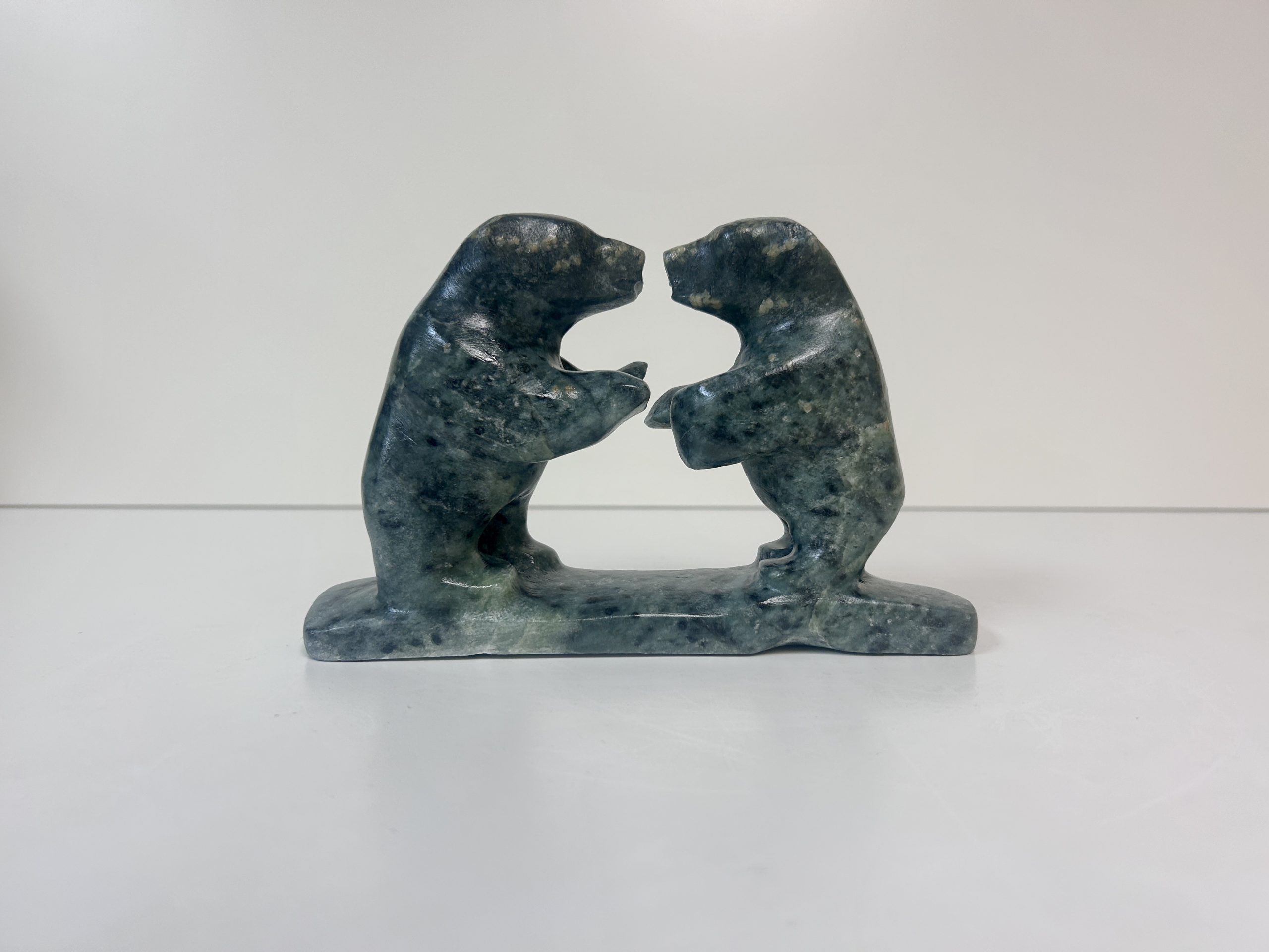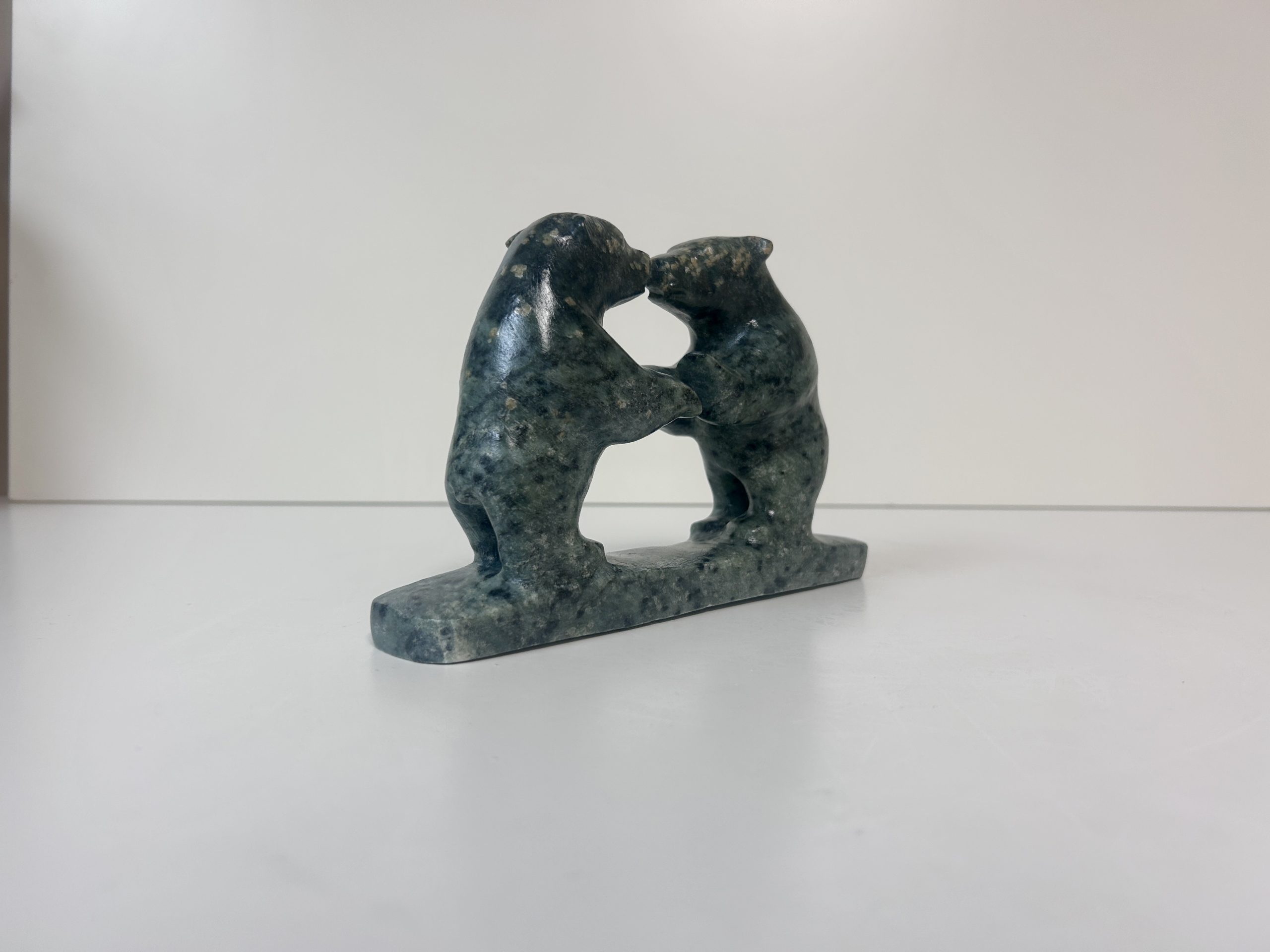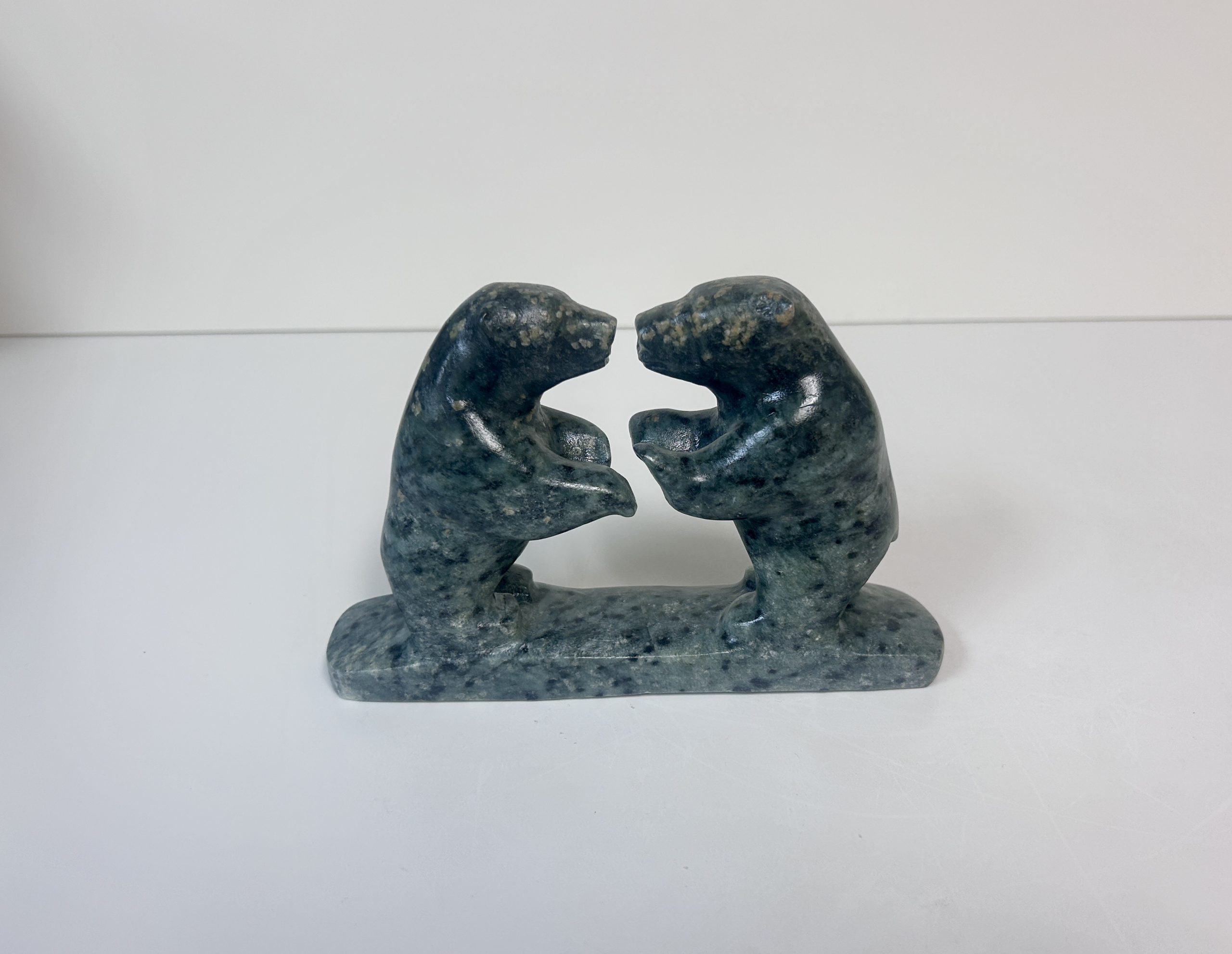 Borealis Bear by Anthony Antoine Appeared on Page 17 of Alberta Native News – June 2018 Beautiful and unique colouring Handmade from soapstone Measures 15″ in length Measures 5.5″ in height Weighs 13 lbs