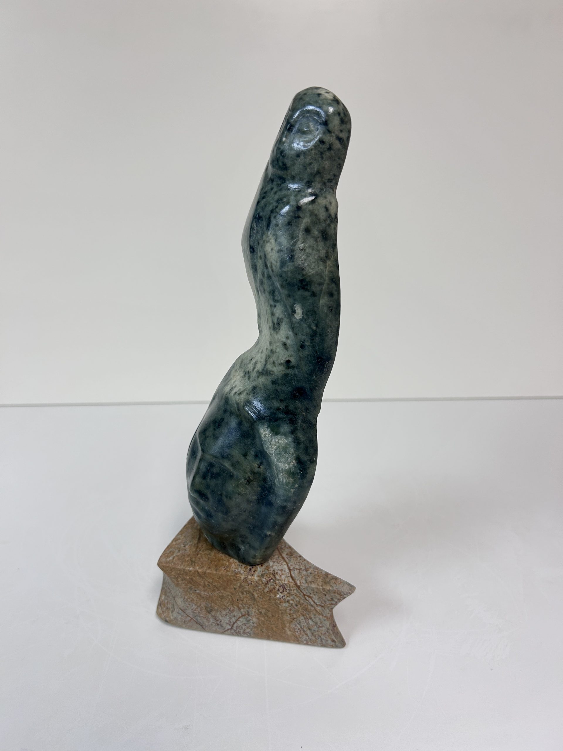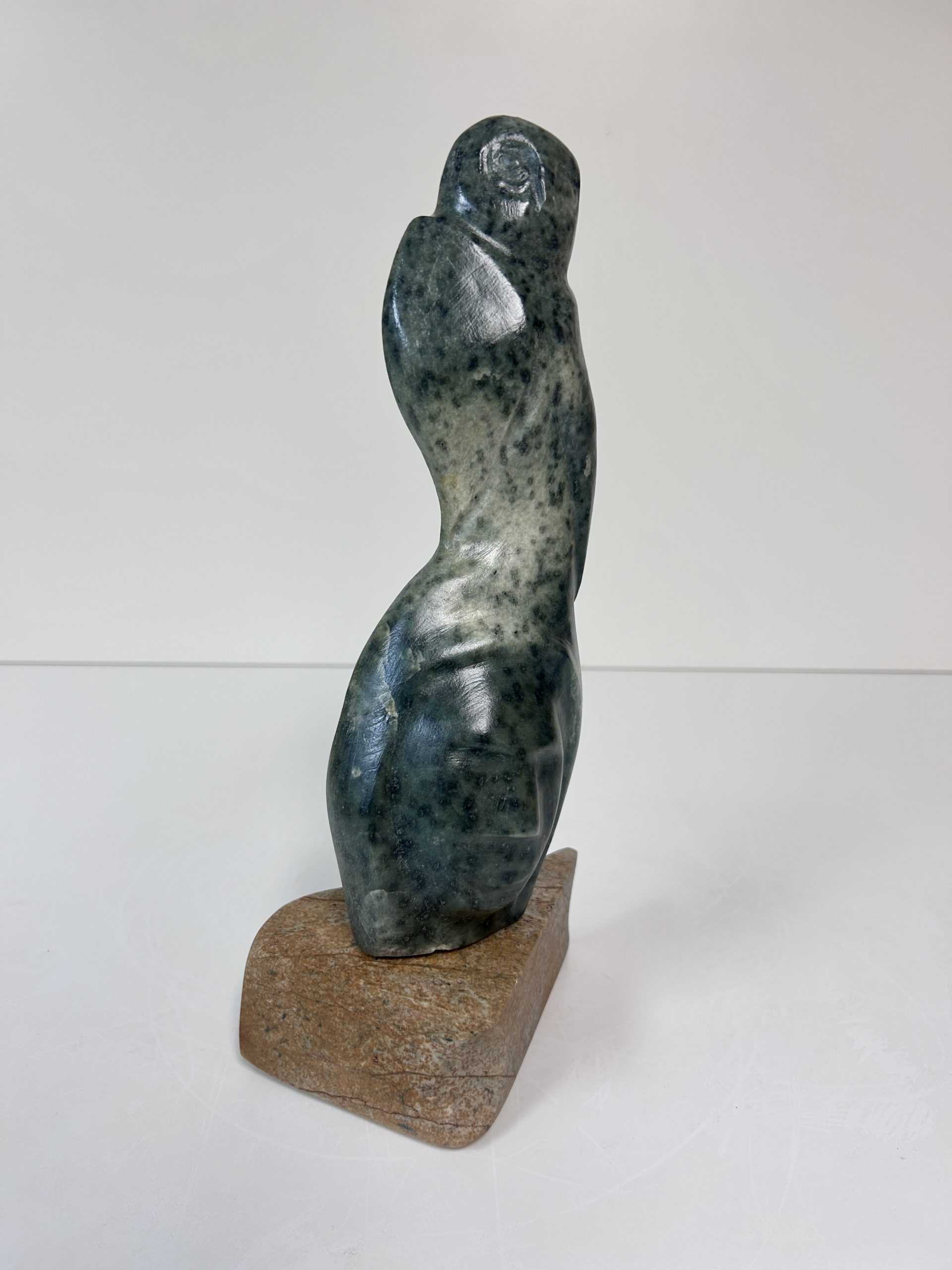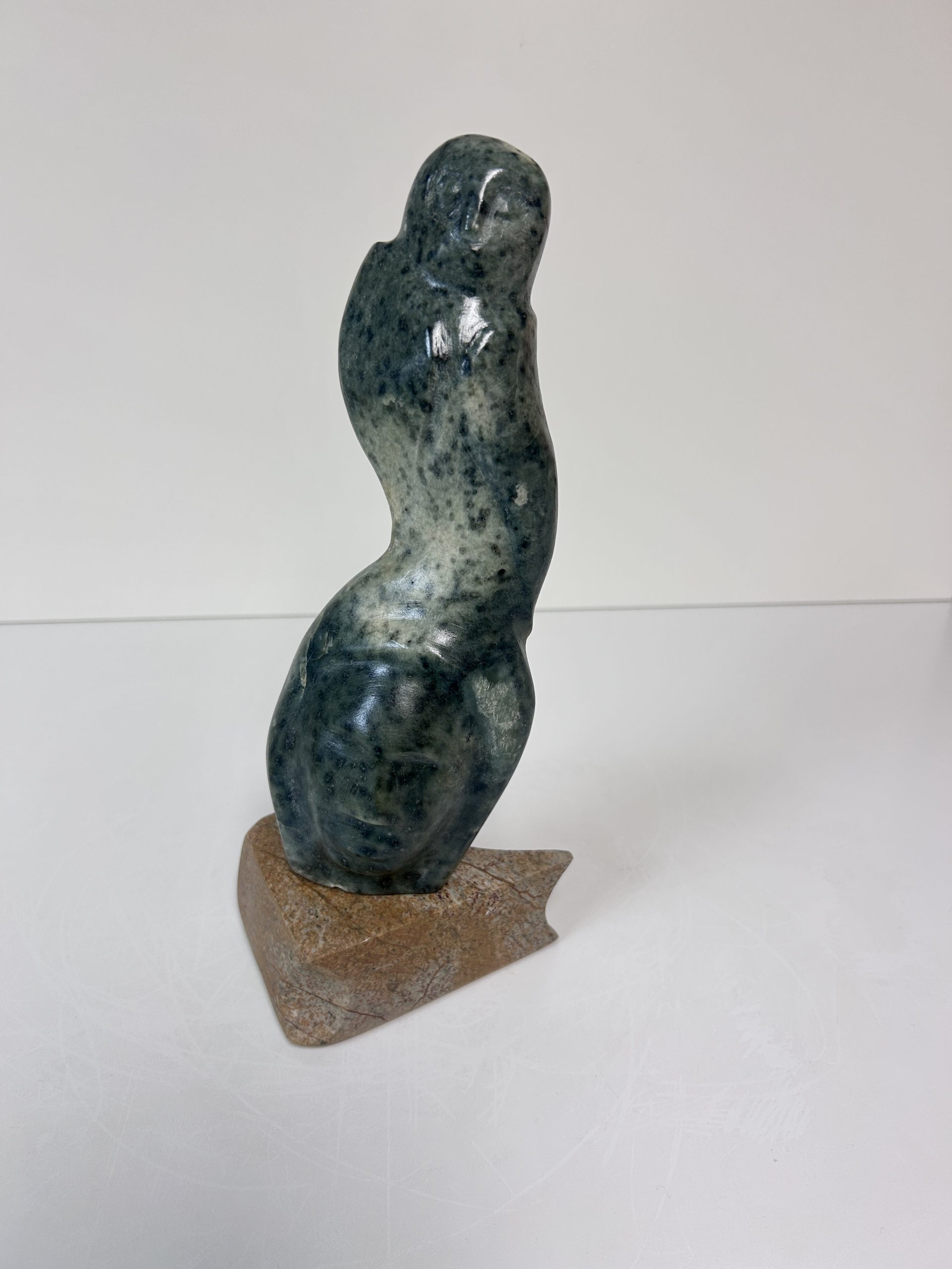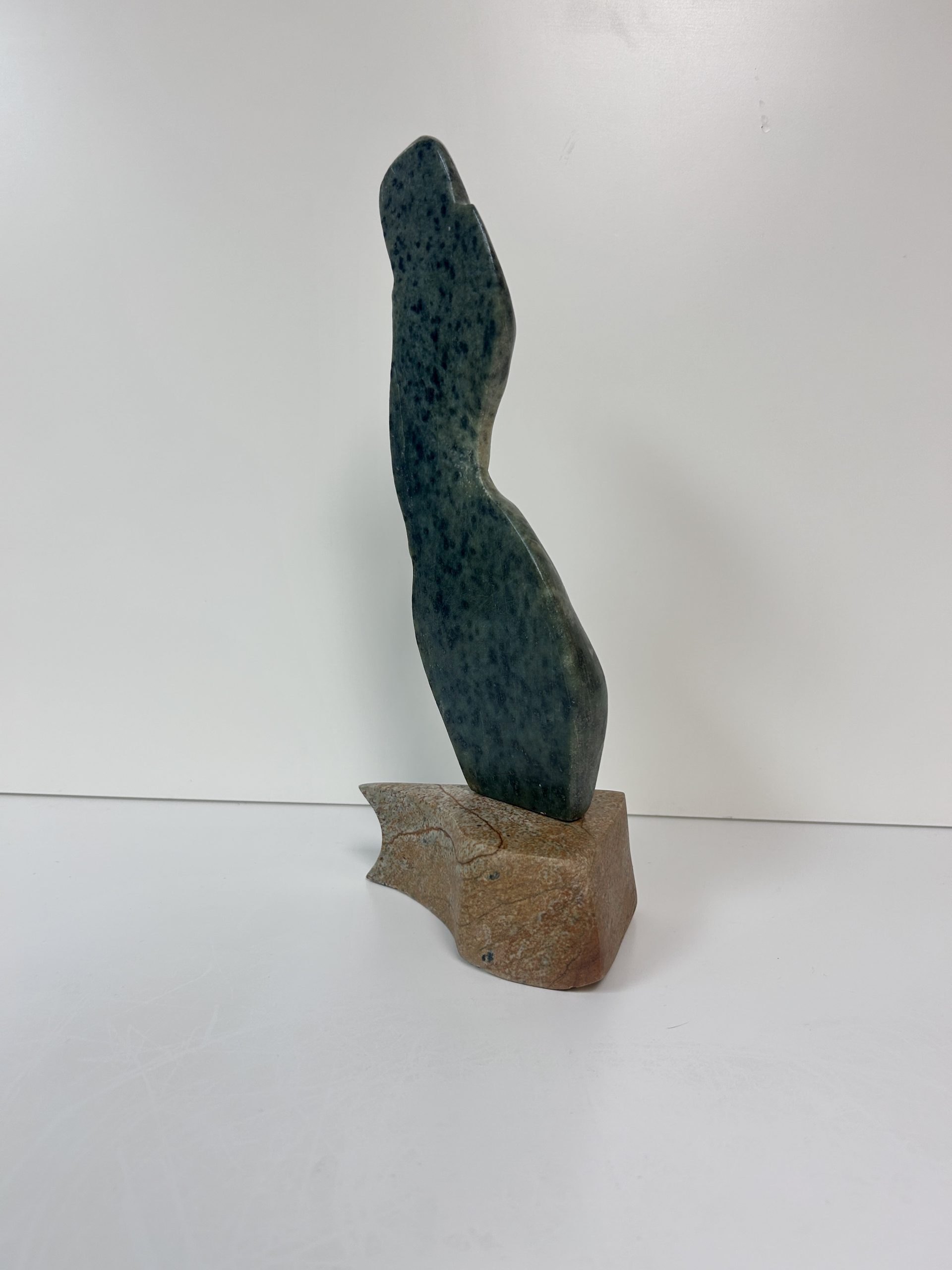 “Diving off the Whale’s Tail” original soapstone carving by Anthony Antoine 11.5″ tall 6.5″ deep Weighs 11.5 lbs