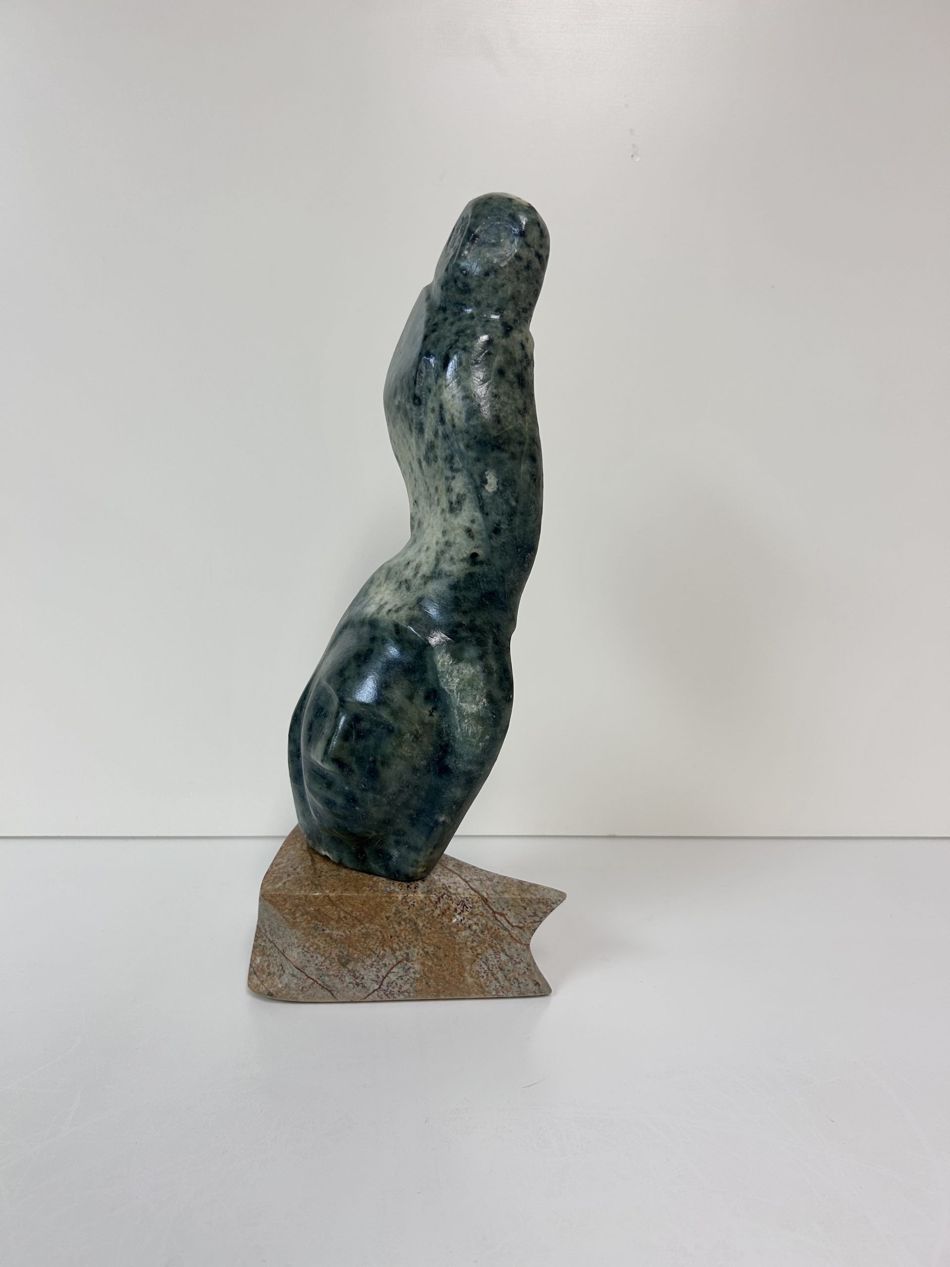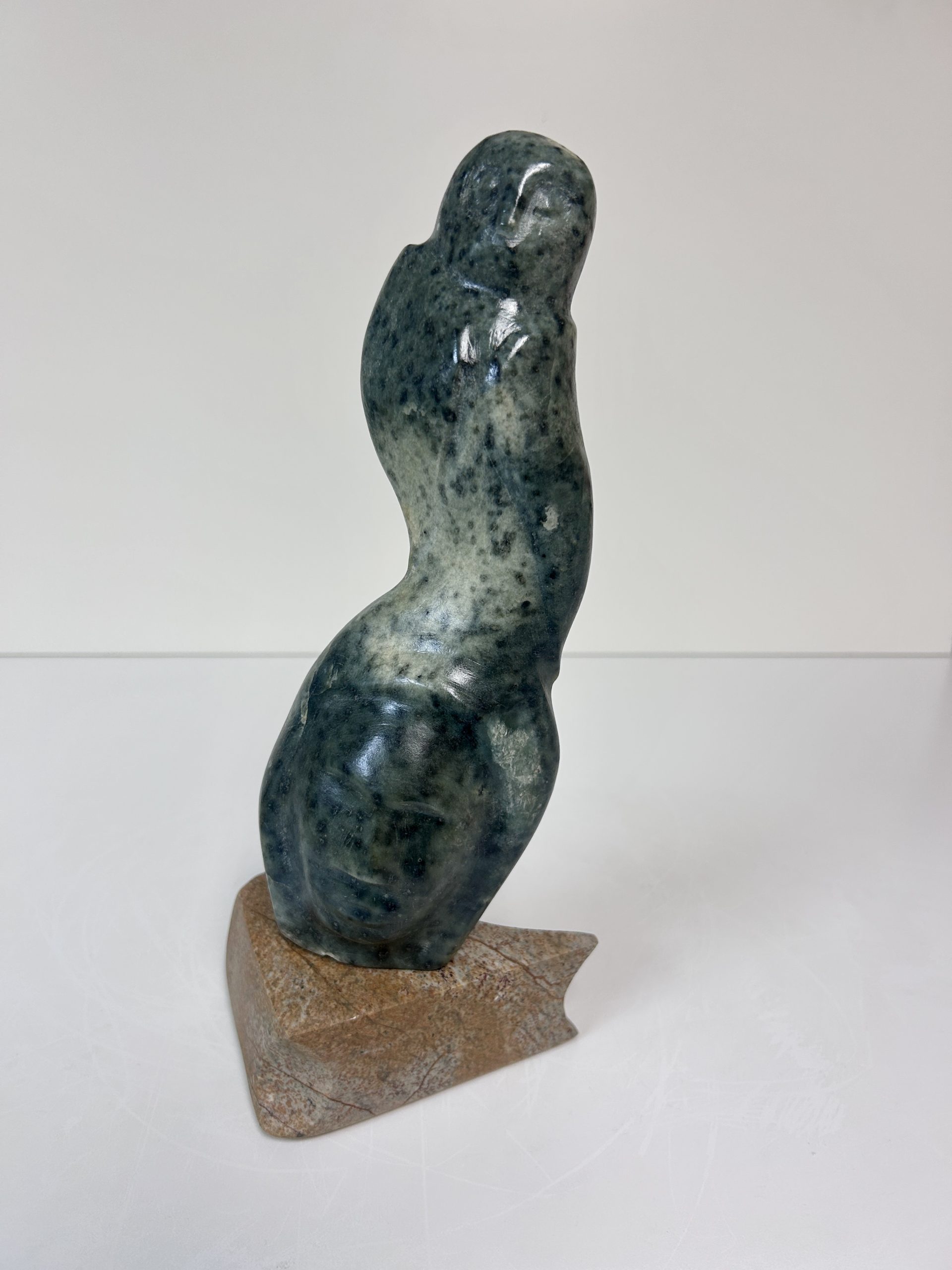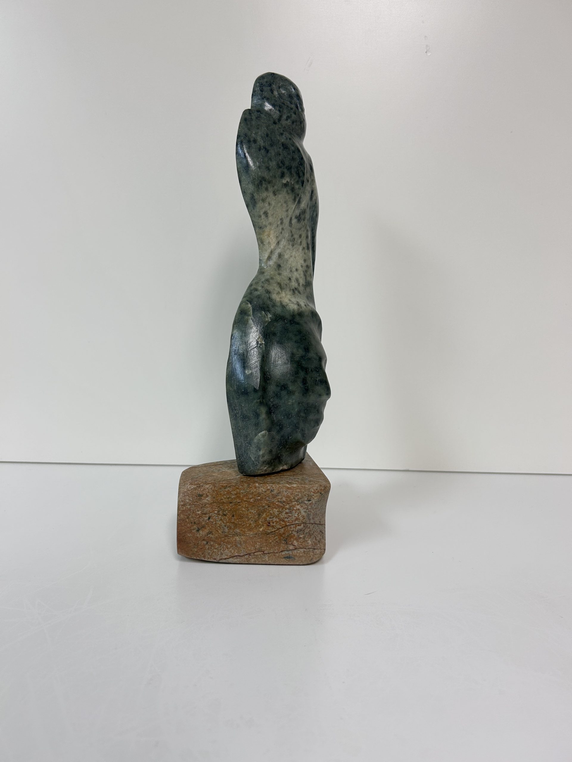 “Diving off the Whale’s Tail” original soapstone carving by Anthony Antoine 11.5″ tall 6.5″ deep Weighs 11.5 lbs