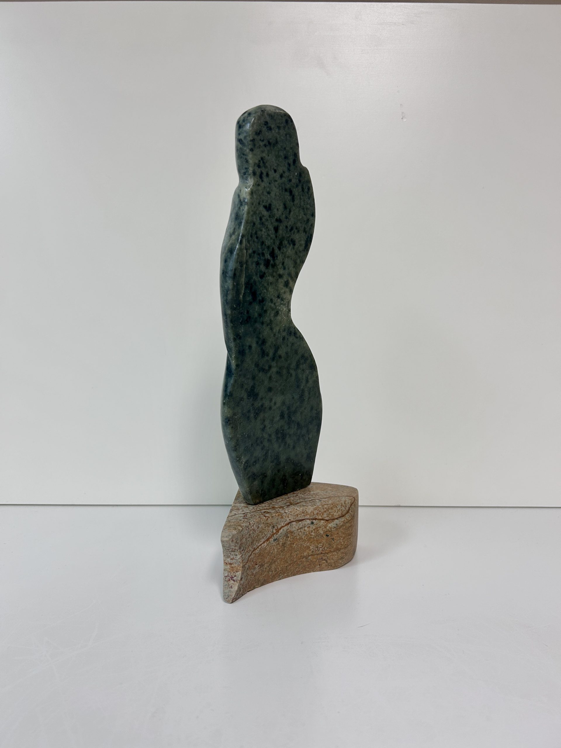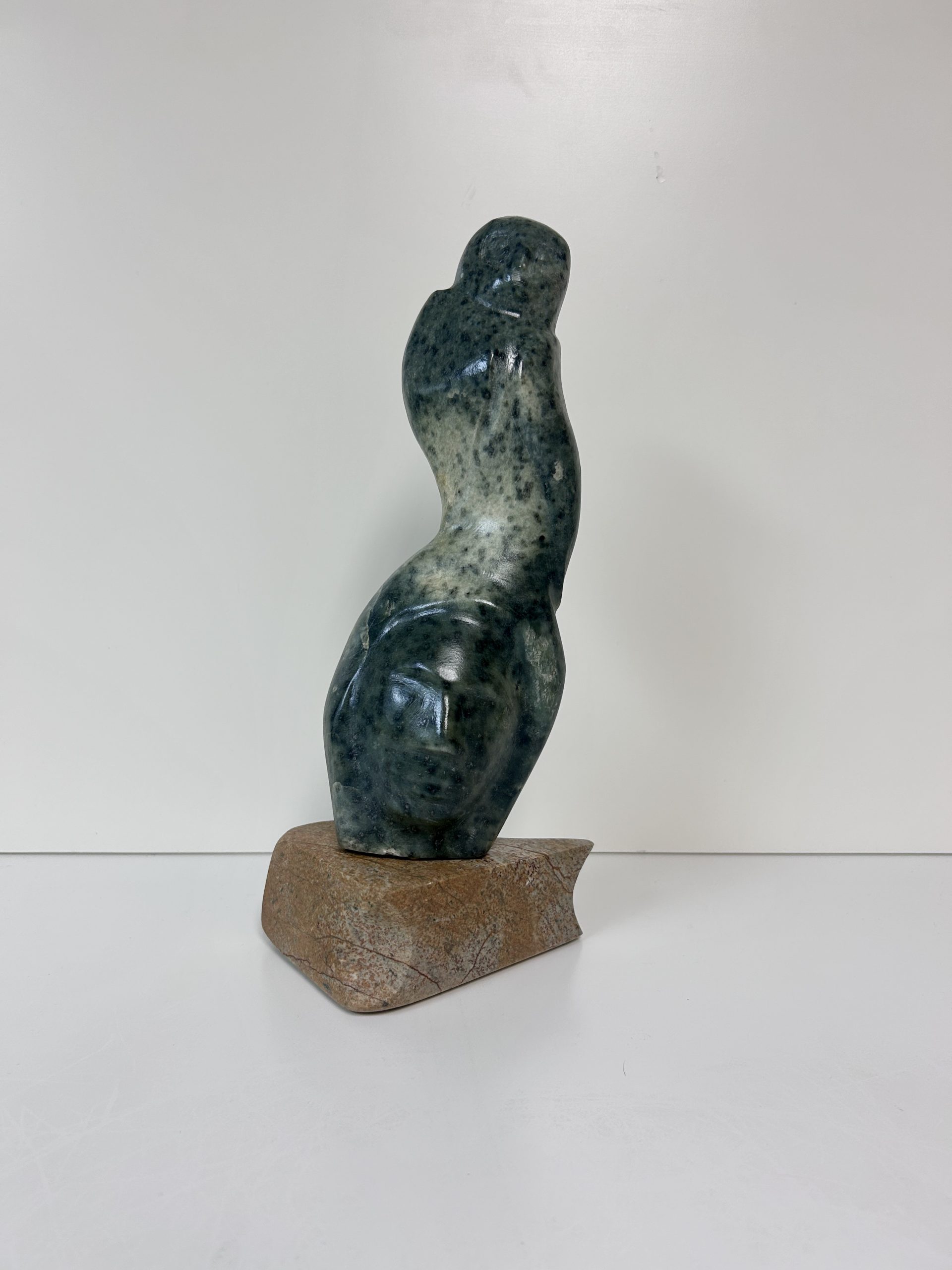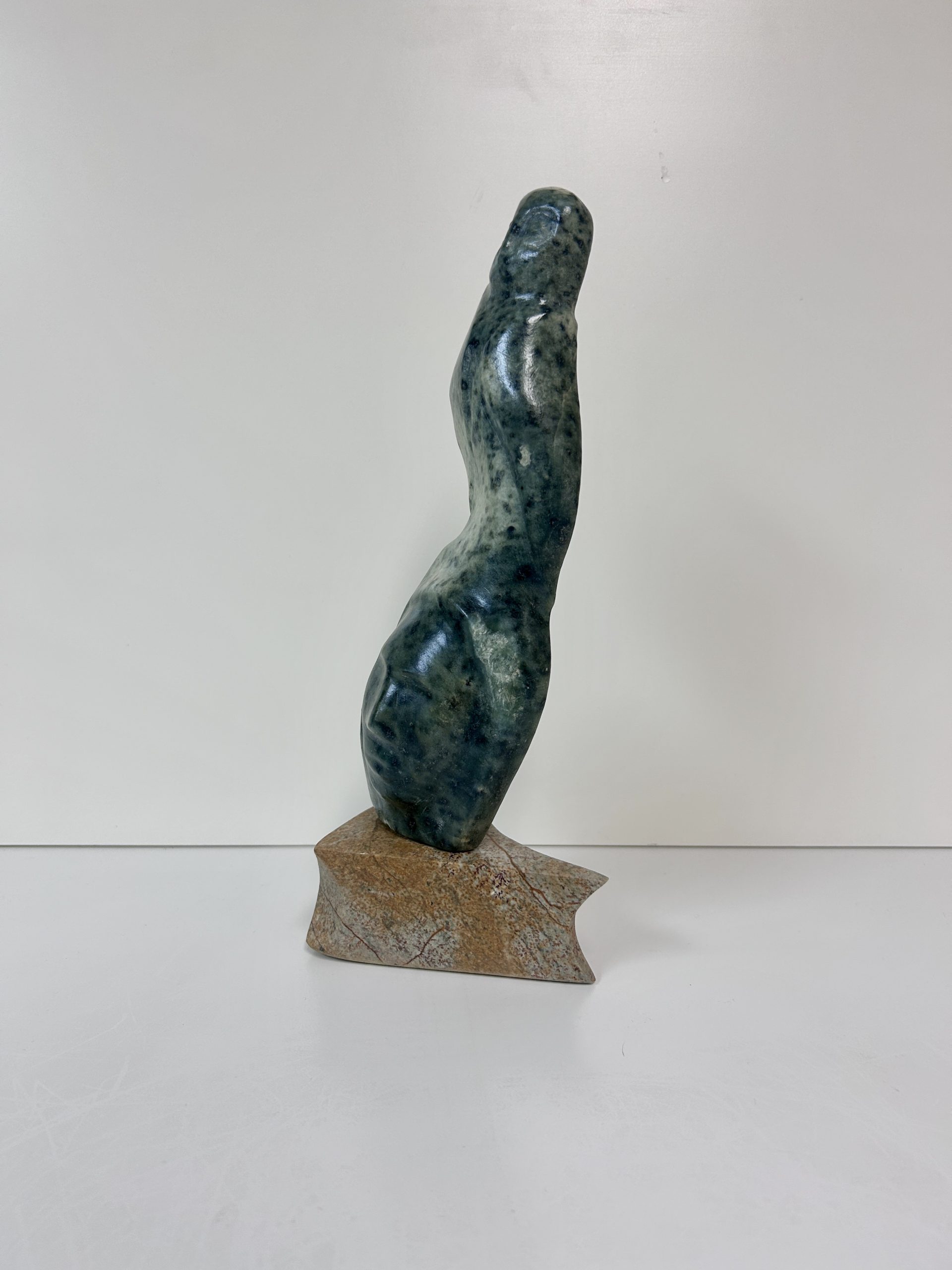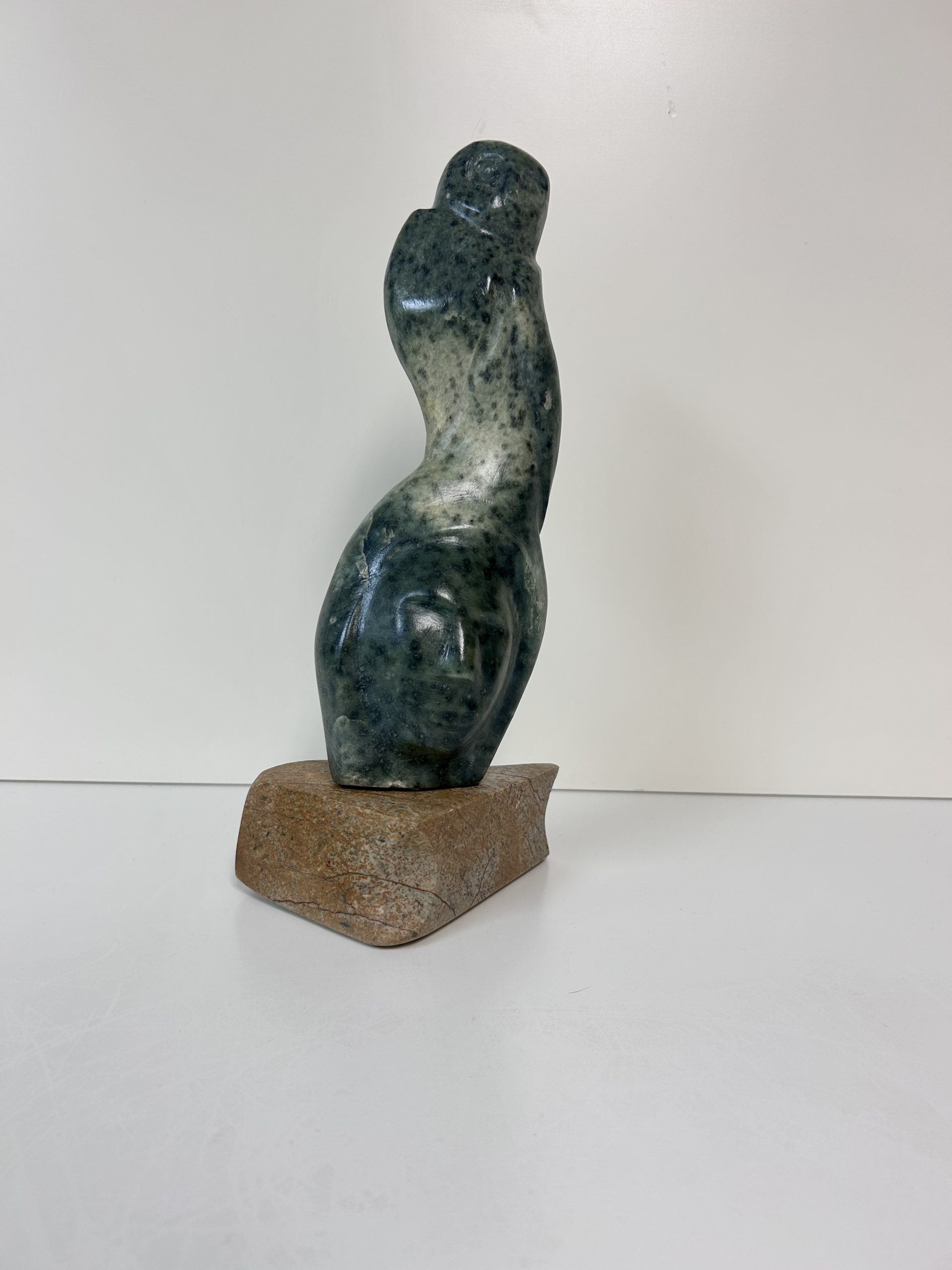 “Diving off the Whale’s Tail” original soapstone carving by Anthony Antoine 11.5″ tall 6.5″ deep Weighs 11.5 lbs